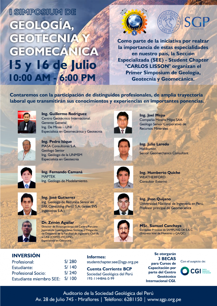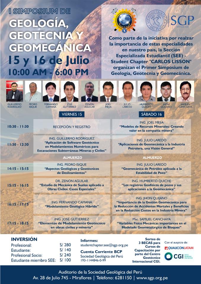 La nueva Sección Especializada Estudiantil - SEE | Student Chapter "CARLOS LISSON" de la SGP, los invita a participar del I Simposium de Geología, Geotecnia y Geomecánica, los días 15 y 16 de julio 2016.